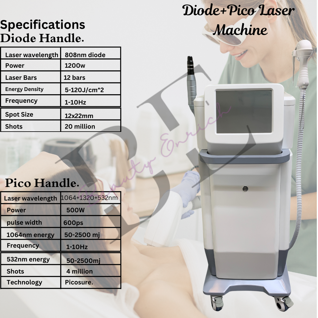 Diode and Pico laser machine, dual laser hair removal and skin rejuvenation, 12 bar diode laser, 500W pico laser, tattoo removal laser, pico laser for pigmentation, diode laser 808nm, carbon peel machine, melasma treatment laser, diode pico machine India, Beauty Enrich laser machines.